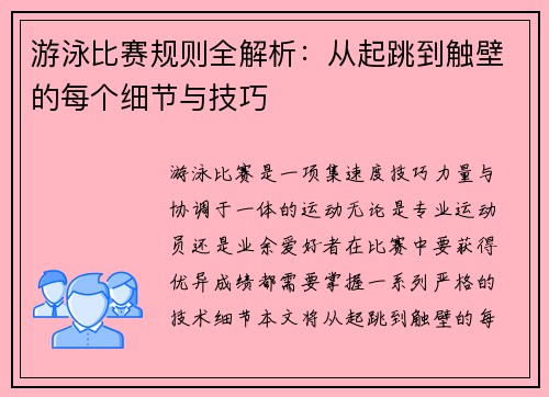 全国游泳比赛作为国内顶尖游泳选手的竞技舞台,每年都吸引着大量的目光。无论是在速度、技术还是体能上,比赛中的选手都能为观众呈现出一场场精彩绝伦的水中竞技秀。本文将从四个方面详细阐述全国游泳比赛的激烈开赛,重点展示比赛中顶尖选手如何展现水中风采与竞技精神。通过对比赛的深入分析,我们不仅能够看到选手们在竞技水平上的比拼,还能感受到他们在压力下展现的坚韧意志和卓越精神。通过对各项比赛项目的解析、选手准备情...